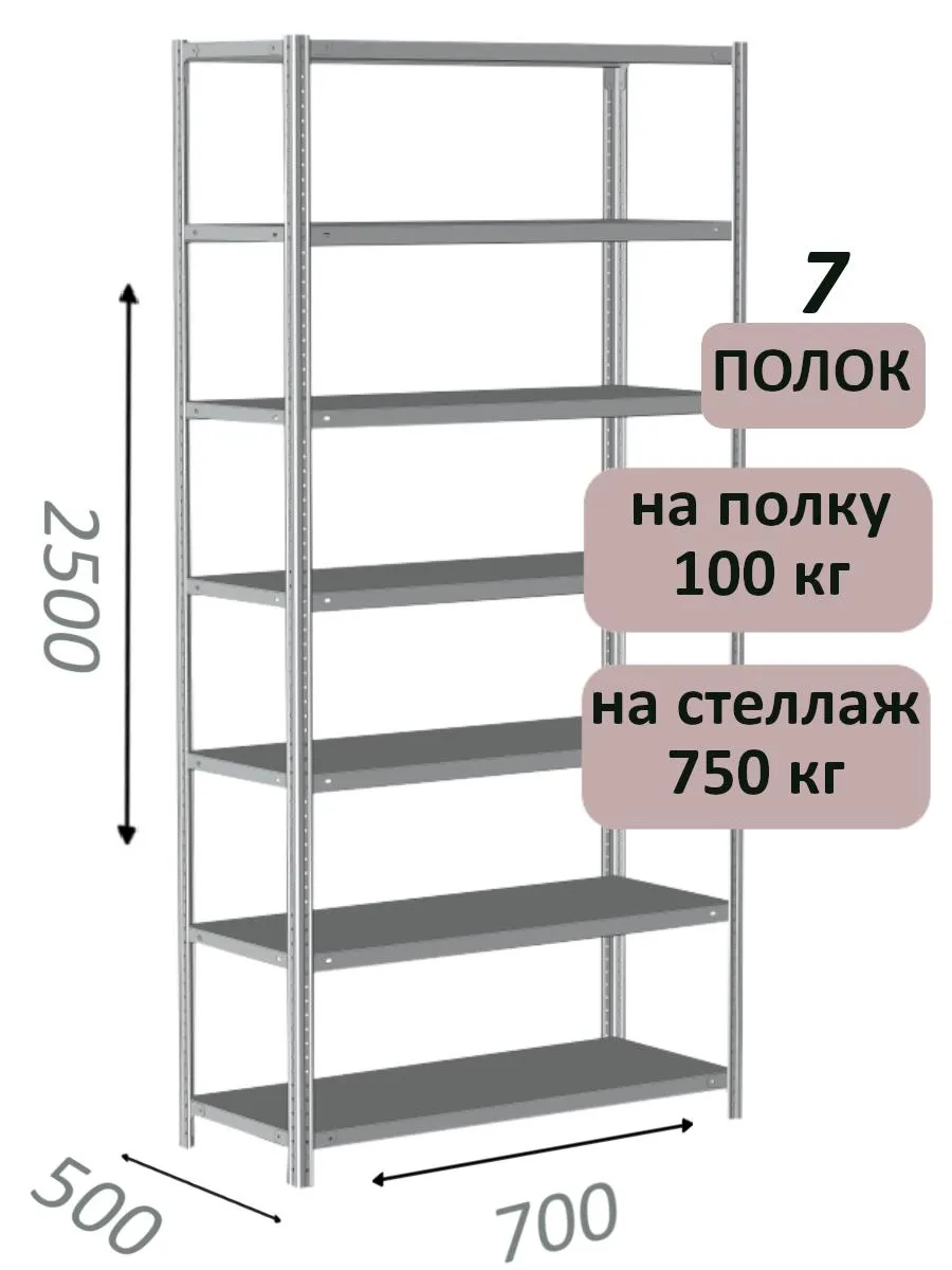 Стеллаж металлический полочный МС 2500х700х500, 7 полок, 100 кг на полку, светло-серый