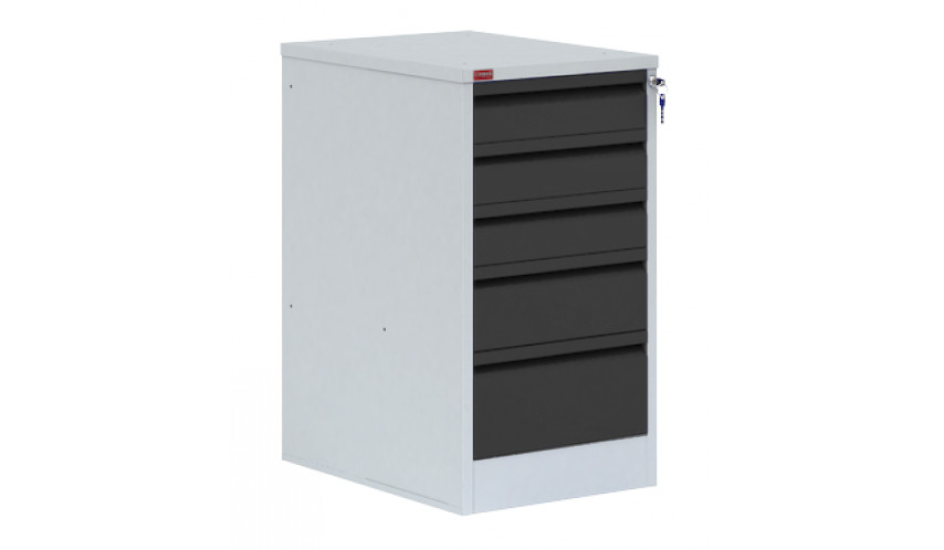 Тумба для металлического верстака может использоваться как с верстаком, так и как отдельный элемент металлического мебели. Состоит из 5-ти выдвижных ящиков на телескопических направляющих, запирающихся на общий замок. Нагрузка на ящик до 30 кг.