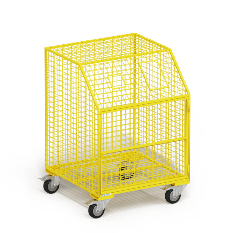 Благодаря прозрачной сетчатой конструкции можно легко контролировать уровень заполнения, не открывая контейнер. Прочная сварная рама выдерживает нагрузку до 200 кг, а колёсная база с тормозами на поворотных колёсах обеспечивает устойчивость при стоянке и удобство при перемещении.