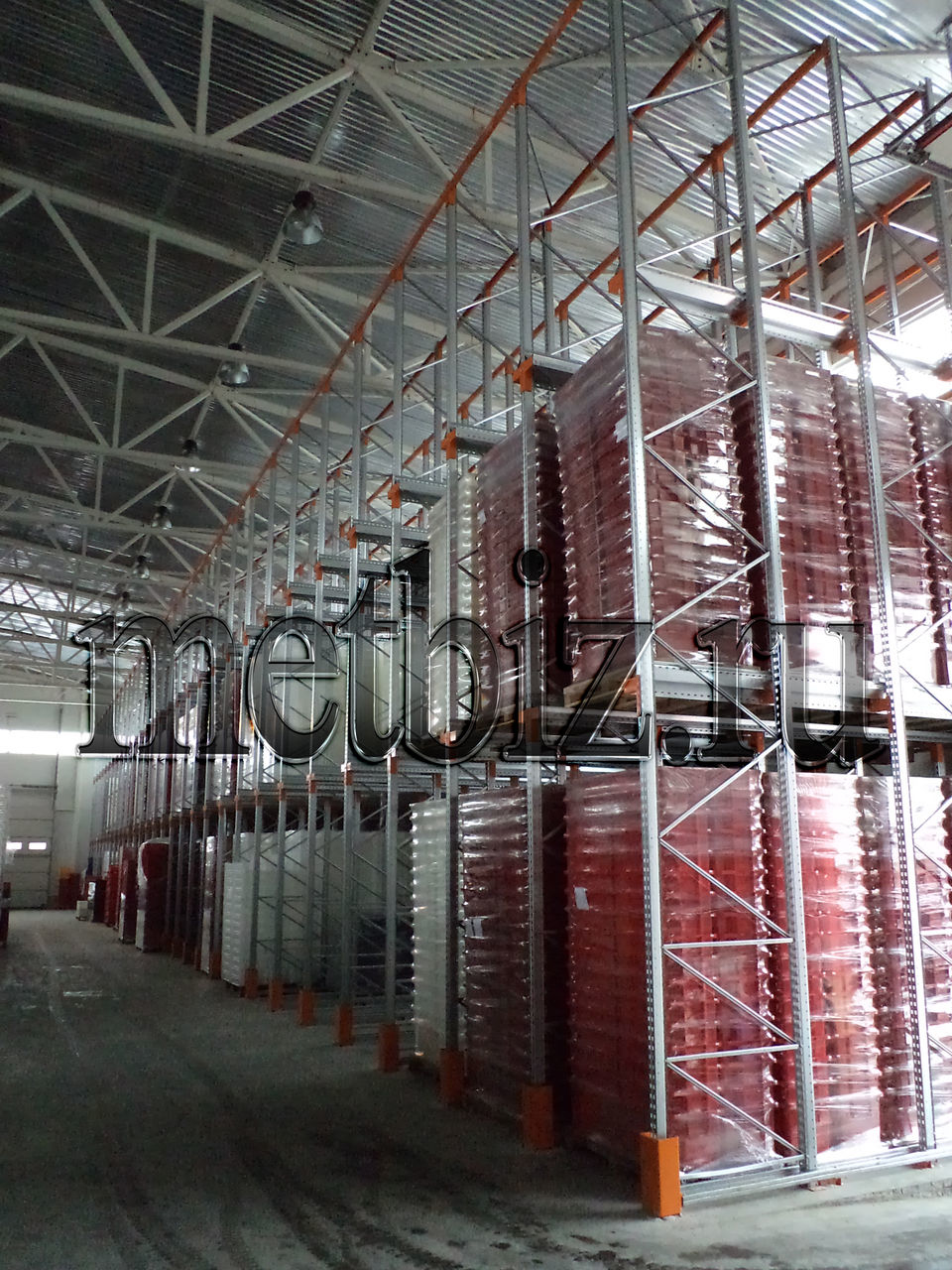 Стеллажи набивные (глубинные) для хранения груза на паллетах. Основная особенность  в том, что разгрузка стеллажа идет только в противоположном порядке от последовательности заполнения, и автопогрузчик может двигаться по освобождаемым проходам., т.е. реализован принцип LIFO.